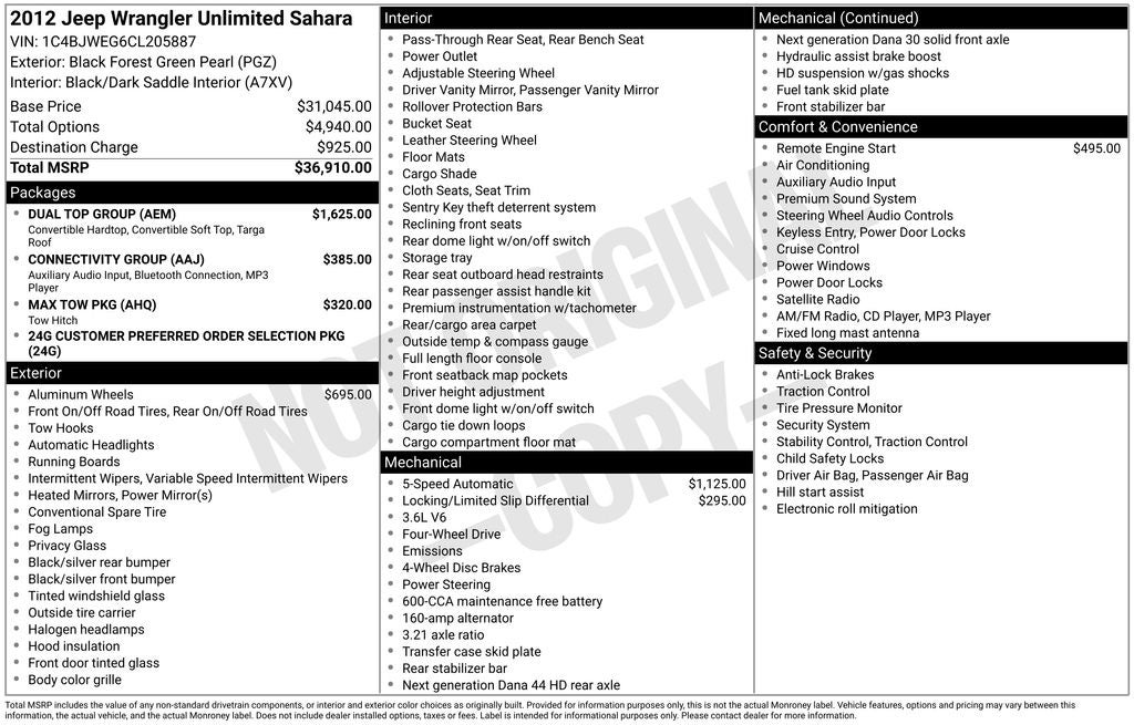SOLD AS IS, 18 x 7.5 Painted Aluminum Wheels, 7 Speakers, AM/FM radio: SIRIUS, Anti-Spin Differential Rear Axle, Black 3-Piece Hard Top, CD player, Class II Receiver Hitch, Cloth Bucket Seats, Connectivity Group, Dual Top Group, Freedom Panel Storage Bag, Front fog lights, Fully automatic headlights, Heavy Duty Suspension w/Gas Shocks, Leather steering wheel, Max Tow Package, Quick Order Package 24G, Rear Window Defroster, Rear Window Wiper/Washer, Remote keyless entry, Sunrider Soft Top, Trailer Sway Damping, Trailer Tow w/4-Pin Connector Wiring, Vehicle Information Center.