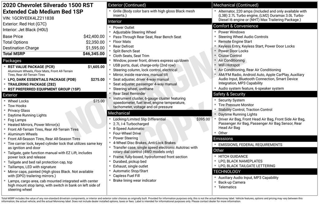 12-Volt Rear Auxiliary Power Outlet, 2 USB Ports (First Row), 4-Way Manual Driver Seat Adjuster, 4.2 Diagonal Color Display Driver Info Center, 4G LTE Wi-Fi Hot Spot Capable, 6-Speaker Audio System, All-Weather Floor Liner (LPO), Black Name Plates (LPO), Black Tailgate CHEVROLET Lettering (LPO), Bluetooth® For Phone, Body Color Grille, Chevrolet Connected Access Capable, Color-Keyed Carpeting Floor Covering, Compass, Dark Essentials Package (LPO), Deep-Tinted Glass, Electric Rear-Window Defogger, Electrical Lock Control Steering Column, Front Frame-Mounted Black Recovery Hooks, Front LED Fog Lamps, Front Rubberized Vinyl Floor Mats, High Gloss Black Mirror Caps, Hitch Guidance, Keyless Open & Start, LED Cargo Area Lighting, Manual Tilt-Wheel Steering Column, OnStar & Chevrolet Connected Services Capable, Power Door Locks, Power Front Windows w/Driver Express Up/Down, Power Front Windows w/Passenger Express Down, Power Rear Windows w/Express Down, Preferred Equipment Group 1SP, Rear 60/40 Folding Bench Seat (Folds Up), Rear Dual USB Charging-Only Ports, Rear Rubberized-Vinyl Floor Mats, Rear Vision Camera, Remote Vehicle Starter System, RST Value Package, Single-Zone Manual/Semi-Automatic Air Conditioning, Steering Wheel Audio Controls, Steering Wheel Mounted Electronic Cruise Control, Theft Deterrent System (Unauthorized Entry), Trailering Package, Urethane Steering Wheel.