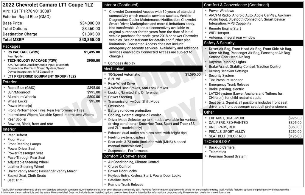 Bose Premium 9-Speaker Audio System Feature, Dark Tint LED Tail Lamps, Decklid-Mounted Lip Spoiler, Dual Mode Exhaust, Power Sunroof, Preferred Equipment Group LT1, Radio: Chevrolet Infotainment 3 Plus System, RS Package, Technology Package.