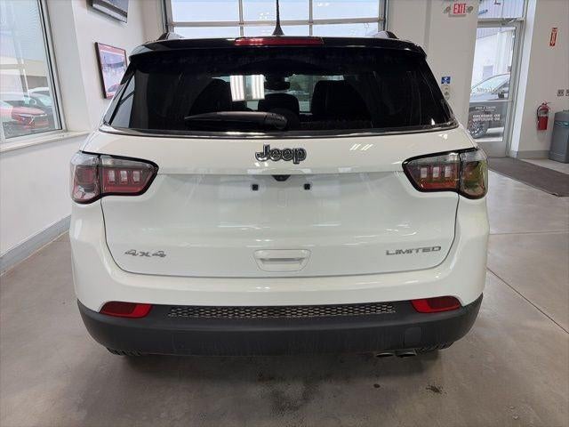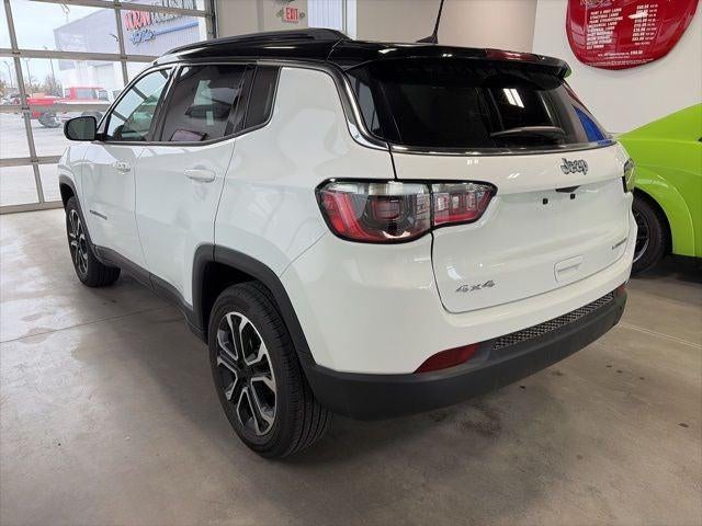 Bright White Clearcoat 2022 Jeep Compass Limited 4WD 9-Speed 948TE Automatic 2.4L I4 4WD, 10.1 Touchscreen Display, 3.73 Axle Ratio, 4-Wheel Disc Brakes, 6 Speakers, ABS brakes, Air Conditioning, Alloy wheels, AM/FM radio: SiriusXM, Anti-whiplash front head restraints, Auto High-beam Headlights, Auto-dimming Rear-View mirror, Automatic temperature control, Brake assist, Bumpers: body-color, Compass, Delay-off headlights, Disassociated Touchscreen Display, Driver door bin, Driver vanity mirror, Dual front impact airbags, Dual front side impact airbags, Electronic Stability Control, Emergency communication system: SiriusXM Guardian, Four wheel independent suspension, Front anti-roll bar, Front Bucket Seats, Front Center Armrest w/Storage, Front dual zone A/C, Front fog lights, Front reading lights, Fully automatic headlights, Global Telematics Box Module (TBM), Gloss Black Exterior Mirrors, Heated door mirrors, Heated front seats, Heated steering wheel, Illuminated entry, Knee airbag, Leather Shift Knob, Leather Trimmed Bucket Seats, Low tire pressure warning, Occupant sensing airbag, Outside temperature display, Overhead airbag, Overhead console, Panic alarm, ParkView Rear Back-Up Camera, Passenger door bin, Passenger vanity mirror, Power door mirrors, Power driver seat, Power steering, Power windows, Quick Order Package 2GG, Radio: Uconnect 5 w/10.1 Display, Rain sensing wipers, Rear anti-roll bar, Rear seat center armrest, Rear window defroster, Rear window wiper, Remote keyless entry, Roof rack: rails only, Security system, Speed control, Split folding rear seat, Spoiler, Steering wheel mounted audio controls, Tachometer, Telescoping steering wheel, Tilt steering wheel, Traction control, Trip computer, Turn signal indicator mirrors, Variably intermittent wipers, Wheels: 18 x 7 Painted Diamond Cut Aluminum.