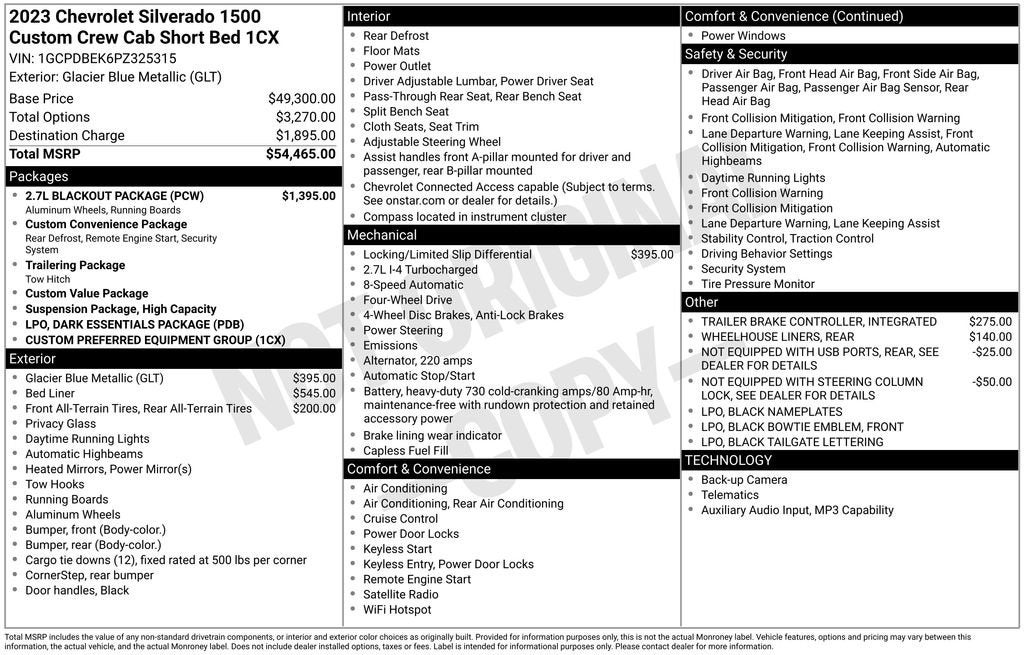 Your Award-Winning Chevrolet Dealer in Clinton Township, MI – Where You Get the Best Price... Period!Certified. Recent Arrival! CARFAX One-Owner. Clean CARFAX.Certification Program Details: After passing our multi-point inspection, every CarBravo-Certified vehicle will receive a 12-month/12,000-mile (whichever comes first) limited bumper-to-bumper warranty - so you can feel confident and protected in your purchase! If the vehicle has bumper-to-bumper coverage remaining under the GM New Vehicle Limited Warranty, then the CarBravo limited bumper-to-bumper warranty coverage will go into effective upon expiration of the original New Vehicle Limited Warranty. If the vehicle's bumper-to-bumper coverage under the GM New Vehicle Limited Warranty has already expired by time or mileage as of the date of the CarBravo transaction, then the CarBravo limited bumper-to-bumper warranty becomes effective on the contract date of the CarBravo sale.Glacier Blue Metallic 2023 Chevrolet Silverado 1500 Custom 4WD 2.7L Turbo 8-Speed Automatic8-Speed Automatic, 4WD, Black Cloth, 10-Way Power Driver Seat w/Lumbar, 120-Volt Instrument Panel Power Outlet, 3.5 Monochromatic Display Driver Info Center, Black Name Plates (LPO), Bluetooth® For Phone, Color-Keyed Carpeting Floor Covering, Compass, Custom Convenience Package, Custom Value Package, Dark Essentials Package (LPO), Deep-Tinted Glass, Dual Rear USB Ports (Charge Only), Electric Rear-Window Defogger, Electrical Steering Column Lock, Electronic Cruise Control, EZ Lift Power Lock & Release Tailgate, Front Frame-Mounted Black Recovery Hooks, Front Rubberized Vinyl Floor Mats, HD Rear Vision Camera, LED Cargo Area Lighting, Manual Tilt Wheel Steering Column, OnStar & Chevrolet Connected Services Capable, Power Front Windows w/Driver Express Up/Down, Power Front Windows w/Passenger Express Down, Power Rear Windows w/Express Down, Preferred Equipment Group 1CX, Rear 60/40 Folding Bench Seat (Folds Up), Rear Rubberized-Vinyl Floor Mats, Remote Keyless Entry, Remote Vehicle Starter System, SiriusXM Radio, Standard Tailgate, Theft Deterrent System (Unauthorized Entry), Trailering Package, Wireless Phone Projection.Moran Chevrolet - (586) 307-6209 - 35500 South Gratiot Ave. Clinton Township, MI 48035.