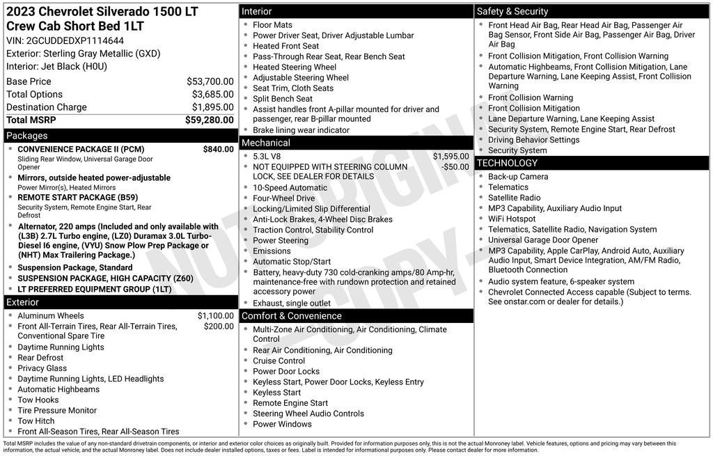 10-Speed Automatic, 4WD, Black Cloth, 10-Way Power Driver Seat w/Lumbar, 12.3 Multicolor Reconfigurable Digital Display, 120-Volt Instrument Panel Power Outlet, All-Star Edition, Auto-Locking Rear Differential, Bluetooth® For Phone, Chrome Mirror Caps, Color-Keyed Carpeting Floor Covering, Compass, Convenience Package, Convenience Package II, Deep-Tinted Glass, Dual Rear USB Ports (Charge Only), Dual-Zone Automatic Climate Control, Electrical Steering Column Lock, Electronic Cruise Control, EZ Lift Power Lock & Release Tailgate, Front Frame-Mounted Black Recovery Hooks, Front Rubberized Vinyl Floor Mats, HD Rear Vision Camera, Heated Driver & Front Outboard Passenger Seats, Heated Power-Adjustable Outside Mirrors, Heated Steering Wheel, Hitch Guidance w/Hitch View, Inside Rear-View Mirror w/Tilt, Integrated Trailer Brake Controller, Keyless Open & Start, LED Cargo Area Lighting, OnStar & Chevrolet Connected Services Capable, Power Front Windows w/Driver Express Up/Down, Power Front Windows w/Passenger Express Down, Power Rear Windows w/Express Down, Power Sliding Rear Window w/Rear Defogger, Preferred Equipment Group 1LT, Rear 60/40 Folding Bench Seat (Folds Up), Rear Rubberized-Vinyl Floor Mats, Remote Start Package, SiriusXM w/360L, Standard Tailgate, Steering Wheel Audio Controls, Trailering App, Trailering Package, Universal Home Remote, Wireless Phone Projection, Wrapped Steering Wheel.
