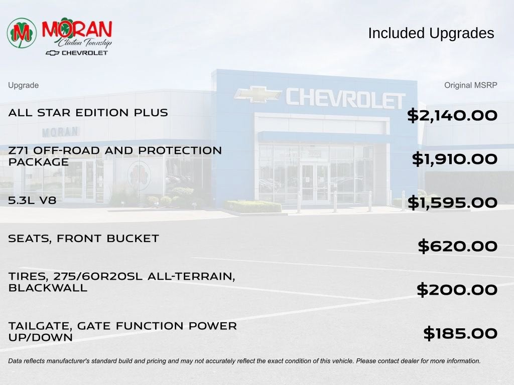 10-Speed Automatic, 4WD, Black Cloth, 10-Way Power Driver Seat w/Lumbar, 12.3 Multicolor Reconfigurable Digital Display, 120-Volt Instrument Panel Power Outlet, 6-Speaker Audio System, All Star Edition Plus, All-Star Edition, All-Weather Floor Liner (LPO) (AAK), Auto-Locking Rear Differential, Bluetooth® For Phone, Chevytec Spray-On Black Bedliner, Color-Keyed Carpeting Floor Covering, Compass, Convenience Package, Convenience Package II, Deep-Tinted Glass, Dual Rear USB Ports (Charge Only), Dual-Zone Automatic Climate Control, Electric Rear-Window Defogger, Electrical Steering Column Lock, Electronic Cruise Control, EZ Lift Power Lock & Release Tailgate, Front Frame-Mounted Black Recovery Hooks, Front LED Fog Lamps, Front Rubberized Vinyl Floor Mats, HD Rear Vision Camera, Heated Driver & Front Outboard Passenger Seats, Heated Power-Adjustable Outside Mirrors, Heated Steering Wheel, High Gloss Black Mirror Caps, Inside Rear-View Mirror w/Tilt, Keyless Open & Start, LED Cargo Area Lighting, OnStar & Chevrolet Connected Services Capable, Power Front Windows w/Driver Express Up/Down, Power Front Windows w/Passenger Express Down, Power Rear Windows w/Express Down, Preferred Equipment Group 1SP, Protection Package, Rear 60/40 Folding Bench Seat (Folds Up), Rear Rubberized-Vinyl Floor Mats, Rear Wheelhouse Liners, Remote Vehicle Starter System, SiriusXM w/360L, Standard Tailgate, Steering Wheel Audio Controls, Theft Deterrent System (Unauthorized Entry), Trailering Package, Wheels: 20 x 9 Painted Aluminum, Wireless Phone Projection, Wrapped Steering Wheel, Z71 Off-Road & Protection Package, Z71 Off-Road Package.