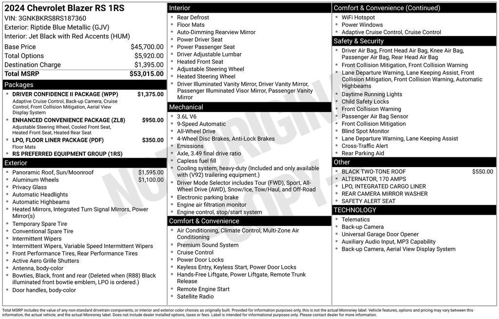Your Award-Winning Chevrolet Dealer in Clinton Township, MI – Where You Get the Best Price... Period!Certified. Recent Arrival! CARFAX One-Owner. Clean CARFAX. Odometer is 6816 miles below market average!Certification Program Details: After passing our multi-point inspection, every CarBravo-Certified vehicle will receive a 12-month/12,000-mile (whichever comes first) limited bumper-to-bumper warranty - so you can feel confident and protected in your purchase! If the vehicle has bumper-to-bumper coverage remaining under the GM New Vehicle Limited Warranty, then the CarBravo limited bumper-to-bumper warranty coverage will go into effective upon expiration of the original New Vehicle Limited Warranty. If the vehicle's bumper-to-bumper coverage under the GM New Vehicle Limited Warranty has already expired by time or mileage as of the date of the CarBravo transaction, then the CarBravo limited bumper-to-bumper warranty becomes effective on the contract date of the CarBravo sale.Riptide Blue 2024 Chevrolet Blazer RS AWD 3.6L V6 SIDI 9-Speed Automatic with OverdriveAWD, Adaptive Cruise Control, Bose Premium 8-Speaker Audio System Feature, Driver Confidence II Package, Enhanced Automatic Emergency Braking, Enhanced Convenience Package, HD Surround Vision, Heated Rear Outboard Seating Positions, Heated Steering Wheel, Memory Settings For Driver Seat & Exterior Mirrors, Power Panoramic Tilt-Sliding Sunroof, Power Tilt & Telescoping Steering Column, Preferred Equipment Group 1RS, Rear Camera Mirror, Safety Alert Seat, Ventilated Driver & Front Passenger Seats.Moran Chevrolet - (586) 307-6209 - 35500 South Gratiot Ave. Clinton Township, MI 48035.
