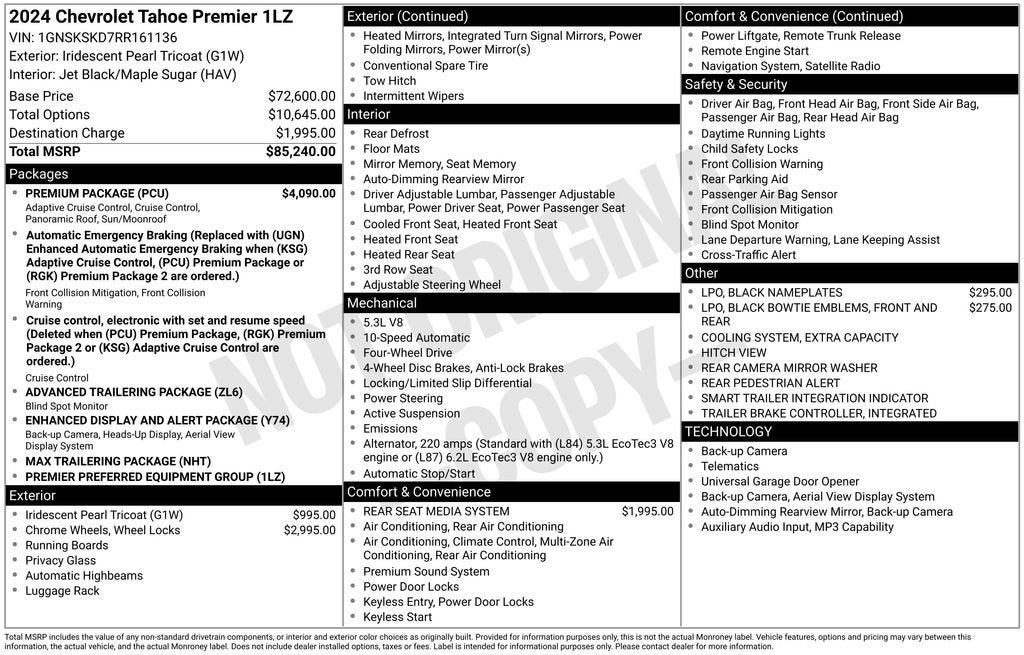Your Award-Winning Chevrolet Dealer in Clinton Township, MI – Where You Get the Best Price... Period!Certified. Recent Arrival! CARFAX One-Owner. Clean CARFAX. Odometer is 4502 miles below market average!Certification Program Details: After passing our multi-point inspection, every CarBravo-Certified vehicle will receive a 12-month/12,000-mile (whichever comes first) limited bumper-to-bumper warranty - so you can feel confident and protected in your purchase! If the vehicle has bumper-to-bumper coverage remaining under the GM New Vehicle Limited Warranty, then the CarBravo limited bumper-to-bumper warranty coverage will go into effective upon expiration of the original New Vehicle Limited Warranty. If the vehicle's bumper-to-bumper coverage under the GM New Vehicle Limited Warranty has already expired by time or mileage as of the date of the CarBravo transaction, then the CarBravo limited bumper-to-bumper warranty becomes effective on the contract date of the CarBravo sale.Iridescent Pearl Tricoat 2024 Chevrolet Tahoe Premier 4WD EcoTec3 5.3L V8 10-Speed Automatic with Overdrive4WD, Jet Black/Maple Sugar Leather, 15 Diagonal Multi-Color Head-Up Display, 1st & 2nd Row Color-Keyed Carpeted Floor Mats, 2-Speed Active Electronic AutoTrac Transfer Case, 3rd Row 60/40 Power-Folding Split-Bench Seat, Advanced Trailering Package, Auto-Dimming Inside Rear-View Mirror, Bose 10-Speaker Centerpoint Surround Audio Sys Ft, Bright Front & Rear Door Sill Plates, Chrome Door Handles w/Body-Color Strip, Chrome Mirror Caps, Color-Keyed Carpeting Floor Covering, Driver & Front Outboard Passenger Airbags, Dual Exhaust System, Dual-Pane Power Panoramic Sunroof, Enhanced Display & Alert Package, Enhanced Driver Information Center, Extra Capacity Cooling System, Floor Console, Hands-Free Rear Power Programmable Liftgate, HD Surround Vision, Heated 2nd Row Outboard Seats, Heated Steering Wheel, Hill Descent Control, Hitch View w/Pan/Zoom Image Adjustment, Inside Rearview Auto-Dimming Rear Camera Mirror, Integrated Trailer Brake Controller, Lane Change Alert w/Side Blind Zone Alert, LED Daytime Running Lamps, Max Trailering Package, Memory Settings, Outside Heated Power-Adjustable Mirrors, Power Release 2nd Row Bucket Seats, Power Tilt & Telescopic Steering Column, Preferred Equipment Group 1LZ, Premium Package, Rear Camera Mirror Washer, Rear Cross Traffic Alert, Rear Pedestrian Alert, Remote Start, Safety Alert Seat, SiriusXM w/360L, Smart Trailer Integration Indicator, Trailer Side Blind Zone Alert, Universal Home Remote, Wireless Charging, Wrapped Steering Wheel.Moran Chevrolet - (586) 307-6209 - 35500 South Gratiot Ave. Clinton Township, MI 48035.